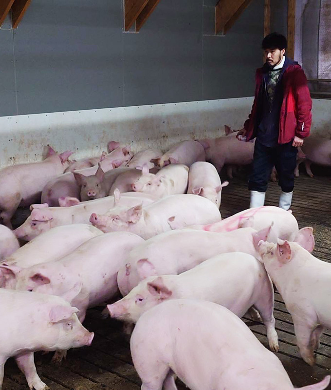 健康な豚を育てるため、農場に入る際のシャワーや清掃・消毒で徹底した衛生管理、常に厳しい目と心配りで豚舎を清潔な環境に保っています。